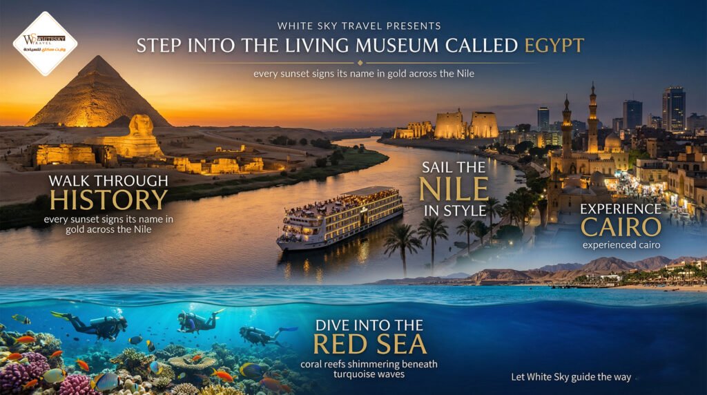 Step into the living museum called Egypt with White Sky Travel… where every sunrise feels like it was designed by an ancient architect and every sunset signs its name in gold across the Nile. 🌅✨